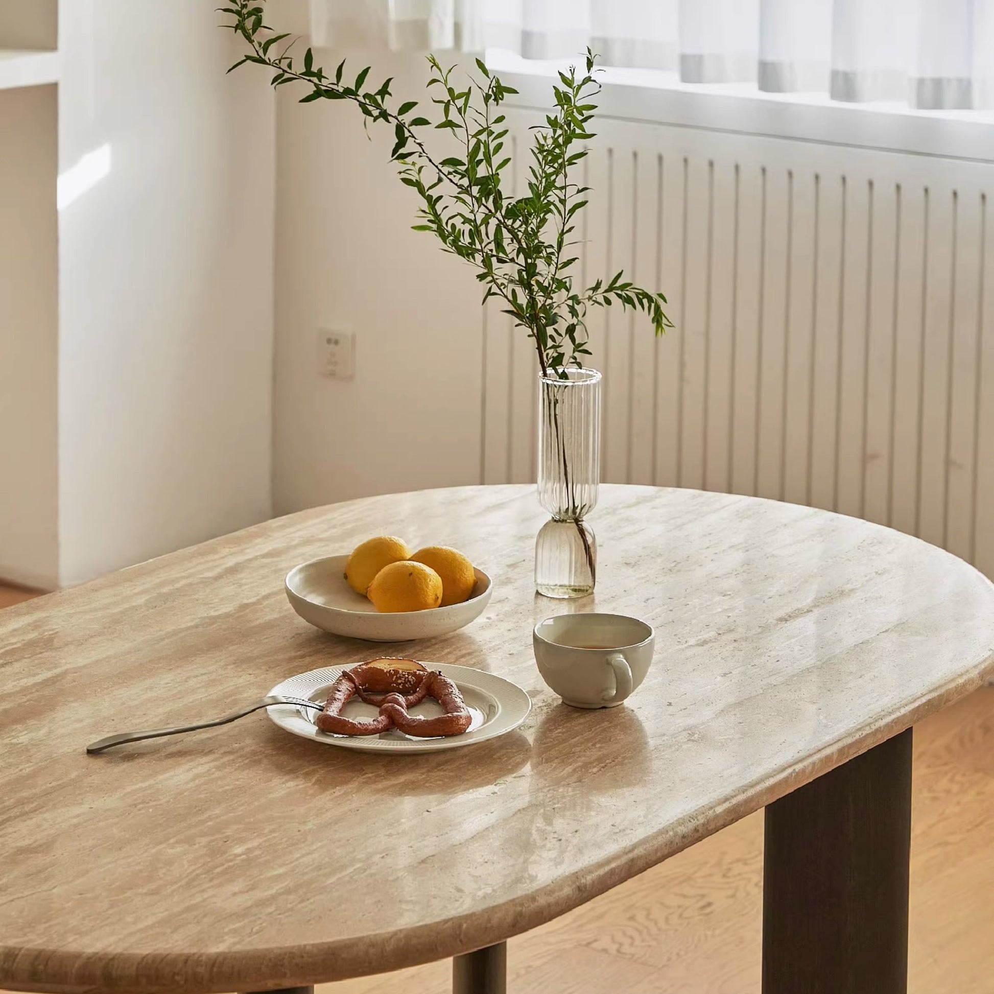 This dining table features an elliptical granite top and four asymmetrical solid wood legs. The uneven distribution of the legs breaks the symmetry of traditional dining tables, and the soft lines and rich layers create a harmonious appearance. The warm texture of the light beige granite contrasts with the stable appearance of the dark solid wood. The low center of gravity design creates a light and floating sensation, and the overall style is simple yet retains a natural warmth. The tabletop material is natural light beige granite, with natural textures and pores on the surface, giving it a serene texture reminiscent of the wabi-sabi style. The edges have been rounded off for enhanced safety. The connection between the tabletop and the legs is fixed with hidden hardware, providing a stable structure and a visually simple design. The solid wood surface has been treated with dark wood wax oil, preserving the wood grain while enhancing its wear resistance. The elliptical tabletop offers an expansive dining space, suitable for 4-6 people. The granite tabletop is scratch-resistant, wear-resistant, and has a warm texture, making it ideal for creating a cozy family dining atmosphere.