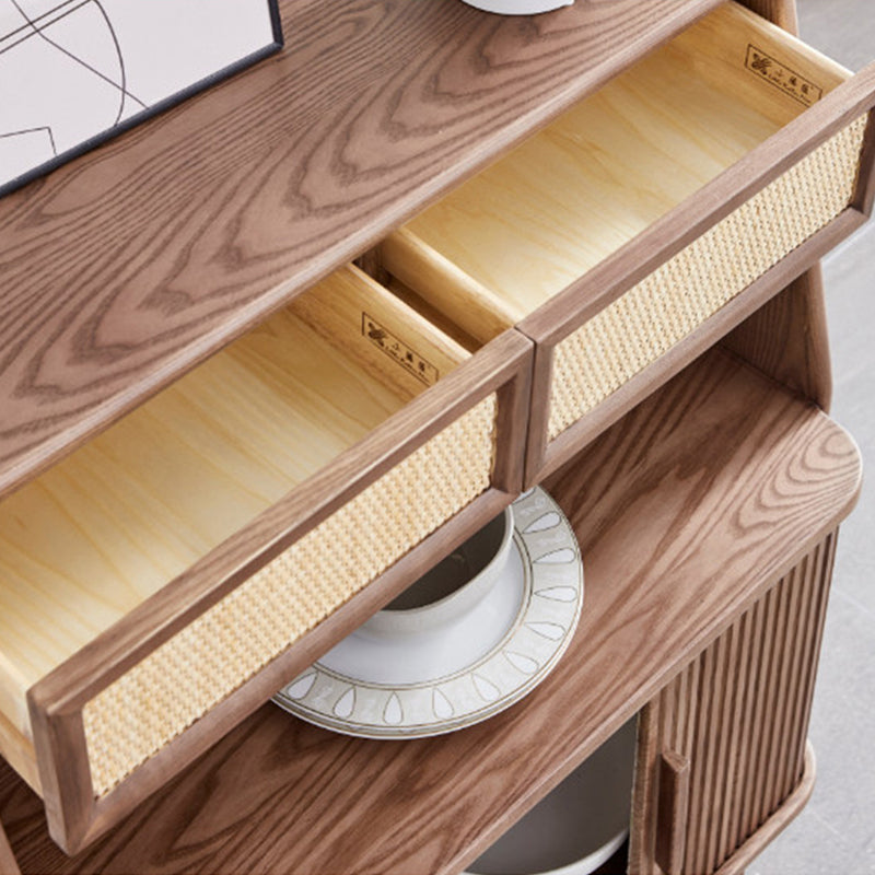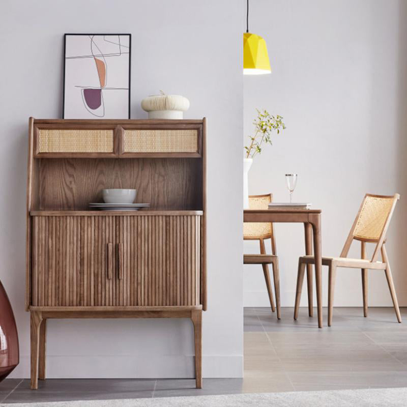 This decorative cabinet is made of imported ash wood from North America, with an environmental protection grade of ENF, no odor, and is suitable for immediate occupancy after installation. Each layer of cabinets is equipped with a single sliding door. The material of the cabinet doors is imported Indonesian agate rattan. The agate rattan has been strictly selected and is hand-woven without any burrs. It combines modern simplicity with medieval retro elements. Placed in the living room, it can serve as a bookcase for showcasing collections, and in the tea room, it can function as a wine cabinet or storage cabinet. The layout of this cabinet is reasonable and beautiful. The single-layer cabinet is divided into two areas, namely the drawer type and the open type. Such an appearance can make the cabinet look more stylish and aesthetically pleasing as a whole. It also features rattan weaving elements, exuding a retro charm.