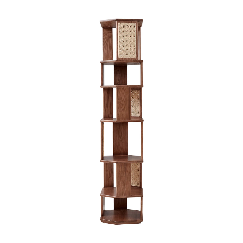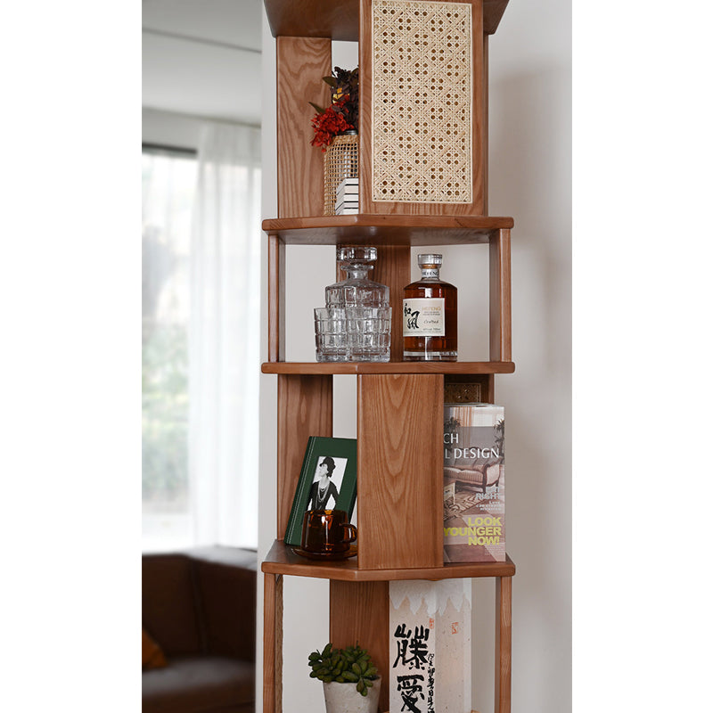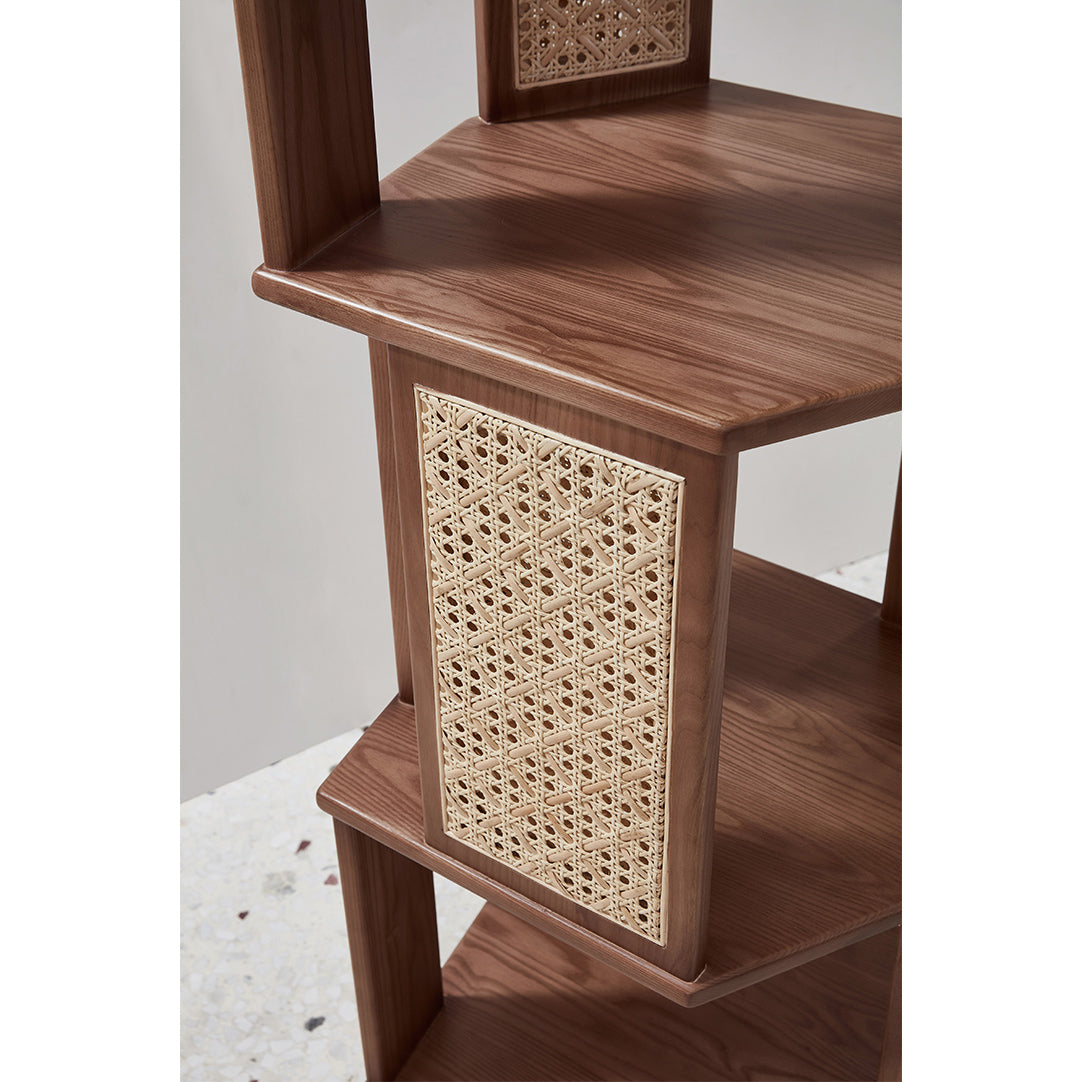 Crafted from high-quality solid wood, it retains the deep and mottled natural traces of the wood, showcasing the texture of time. Adhering to the principles of wabi-sabi style that values simplicity and plainness, the design is simple and elegant. The staggered shelves give this decorative cabinet a more fashionable touch. The walnut-colored cabinet body paired with handcrafted rattan weaving creates a unique and mixed style. It combines display and storage functions, featuring multiple layers of shelves for convenient classification and placement of tea sets, books, and decorations, etc. It can also be used as a wine cabinet.