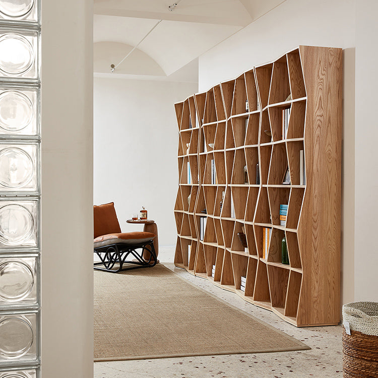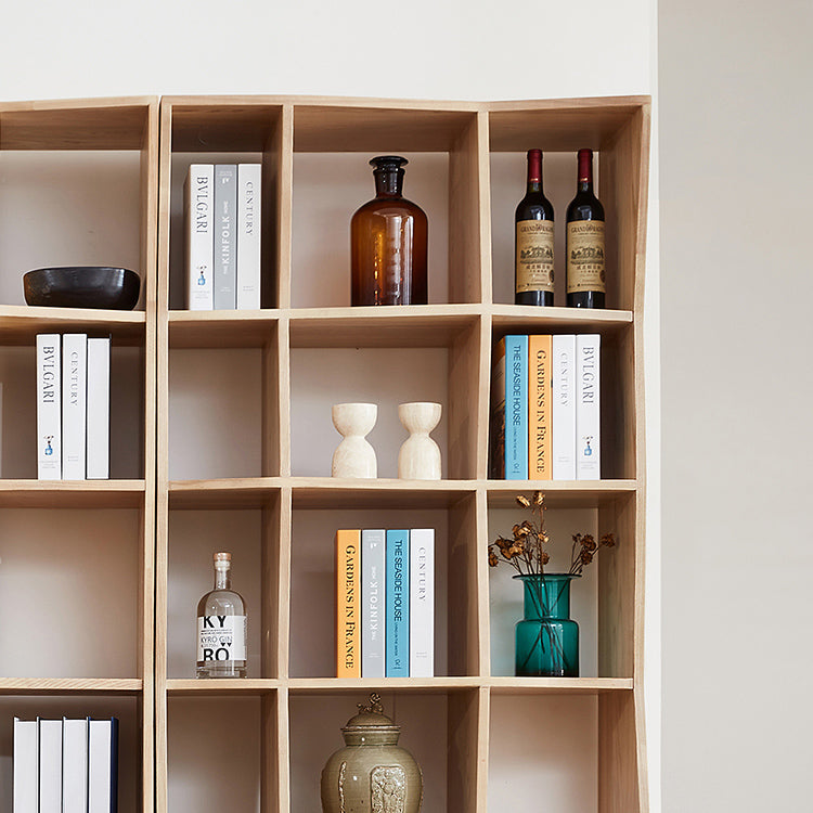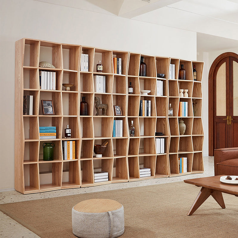 It adopts thickened pure solid wood boards, with healthy material selection, making it more reassuring to use. Moreover, it has good load-bearing capacity and a stable landing. This bookcase features a concave-convex visual effect and is paired with a light wood grain color, making the overall design simple yet not dull. It adopts an open multi-compartment partition design, which can protect the books from falling. Open storage enables users to access items more quickly and conveniently, significantly enhancing work or study efficiency. It can also be used as a decorative cabinet to store various daily necessities.