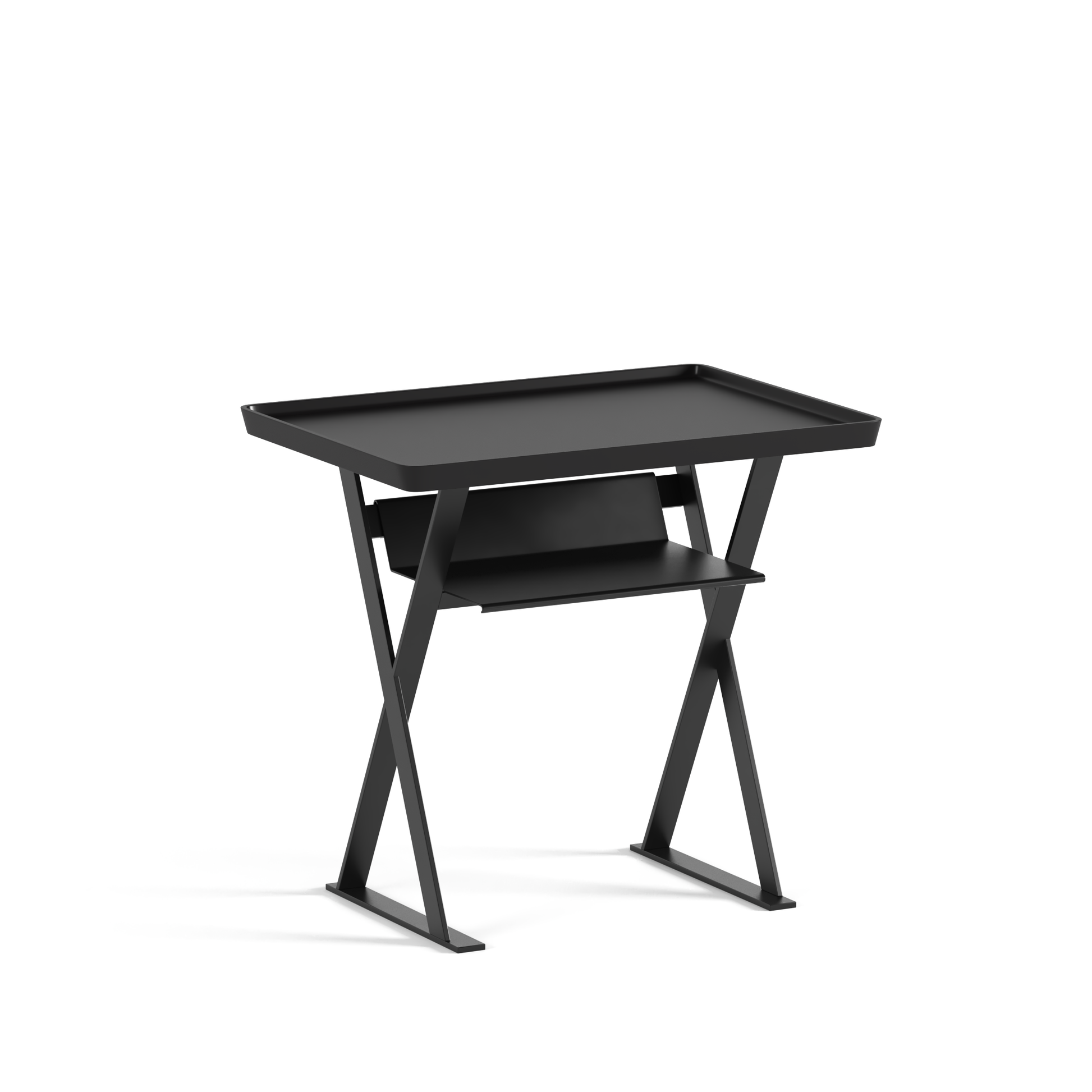 This side table is treated with matte black electrostatic powder coating on its surface. It has a smooth texture, is scratch-resistant and wear-resistant, and does not leave fingerprints. The rectangular tabletop has a slightly raised edge around the perimeter, which effectively prevents items from sliding off and enhances the overall structural sense. The matte black texture is understated and stable, suitable for various modern style spaces. It features an X-shaped cross-support structure, combining lightness with stability. The extended design at the bottom further improves the anti-toppling ability. There is an open storage layer below the tabletop, where small items such as books and remote controls can be placed, increasing the storage space and making the items easily accessible. The overall design has sharp lines and clear functions, suitable for industrial style, modern minimalist, and dark-themed spaces. It is compact and flexible, and can be used as a side table for placing cups and lamps on the sofa, as a bedside table or a small work desk, especially suitable for small spaces or scenarios where temporary storage is needed.