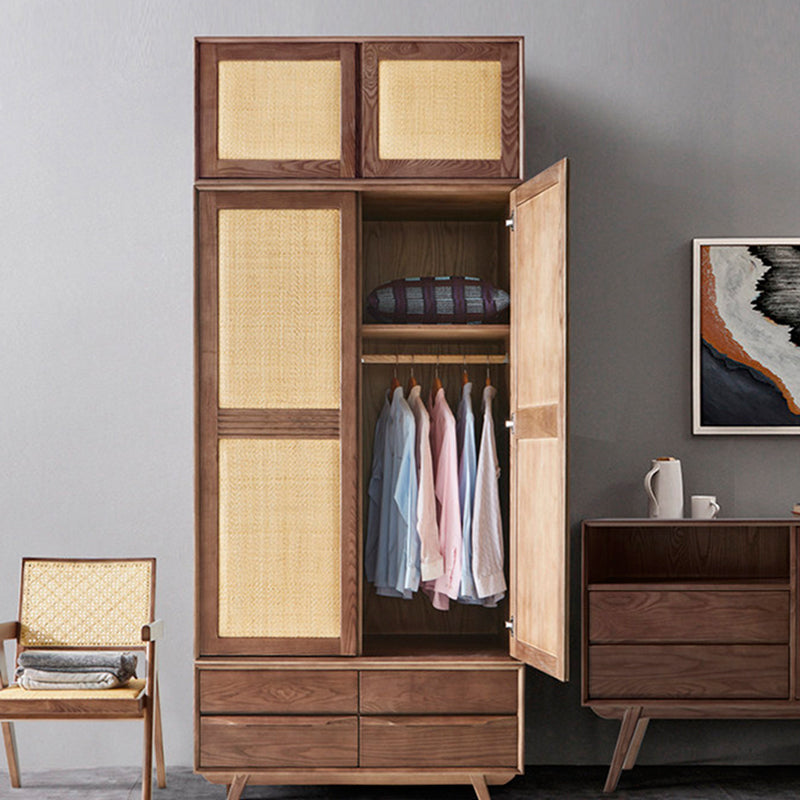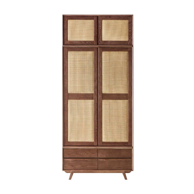 The solid wood sliding door frame is paired with rattan MATS, made of imported agate rattan from Indonesia. The natural material is smooth and fine. The tiny gaps in the rattan allow for air circulation inside the cabinet, which is equivalent to installing an air purifier on the cabinet, keeping your clothes dry at all times. The interior design of the cabinet features multiple compartments, with two large and two small storage areas. The large area can be used to hang long-sleeved shirts and long pants, while the small area can be used to stack seasonal items such as quilts. The top cabinet module can increase storage capacity. The dual-zone large space capacity can store bedding, thick clothes, etc. The base cabinet module is equipped with four separate large drawers, providing diverse compartments for storing trouser cuffs, socks, pajamas, etc., meeting different placement needs. Thick and large board wood is used, with vertical whole boards, doubling the load-bearing capacity and stability. According to the international "anti-cracking and anti-deformation" standards, the wood boards are cut into pieces no wider than 11cm, and then the wood is spliced to compress the wood gaps and reduce longitudinal shrinkage, thereby achieving the effect of preventing cracking and deformation.