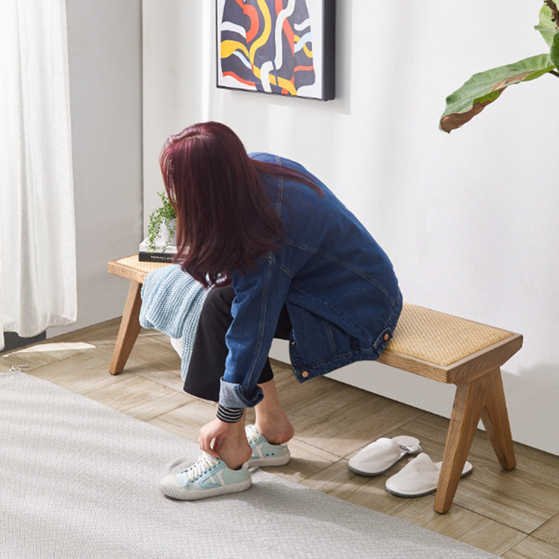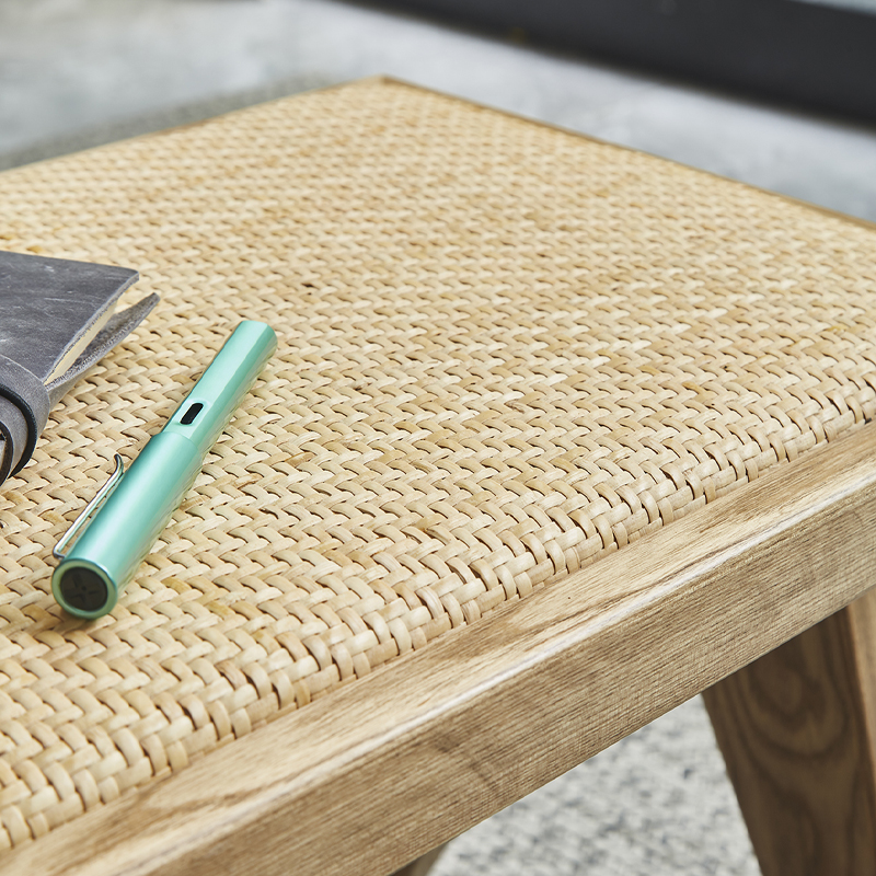 The overall design is simple and elegant, without excessive decoration. It focuses on showcasing the natural grain and original texture of the wood, giving people a sense of simplicity and tranquility. The bench is designed with straight lines, and the legs have A slight inclination Angle. The A-shaped legs design not only enhances stability but also makes the lines more variable. It is made of imported ash wood from North America. These woods have clear grain, are hard in texture, resistant to corrosion, and have good load-bearing capacity and durability. To preserve the natural grain of solid wood, the surface is coated with odorless and environmentally friendly paint. The paint surface is dry, fine and uniform in luster. It not only effectively protects the wood but also enhances the texture of the product. The bench is made by directly splicing whole boards. A single board is directly cut from a tree and then polished and cut. It is not made by piecing together broken boards. This technique retains the natural edges of the wood, straightening one side for easy placement against the wall, while making the grain more fluid and giving it a unique natural beauty. The seat cushion is made of rattan weaving technique, combining imported solid wood frames with rattan weaving, presenting the beauty of the fusion of modernity and tradition. The rattan weaving part has uniform texture, good breathability and a comfortable sitting experience. The bench can also be directly pushed under the dining table, greatly saving space.