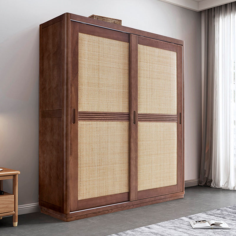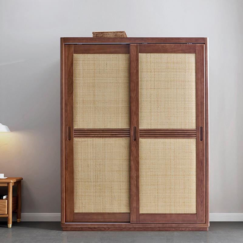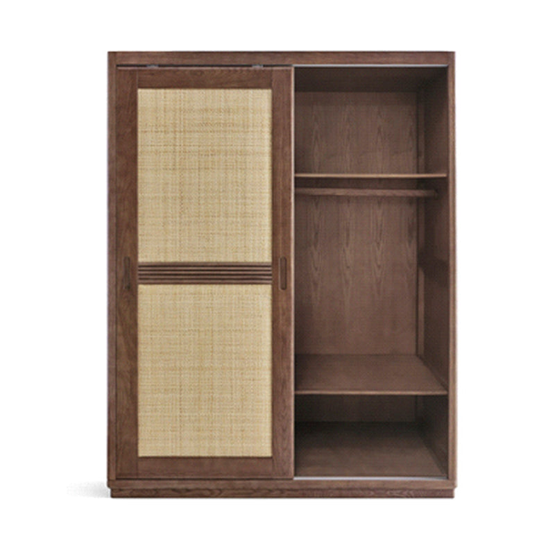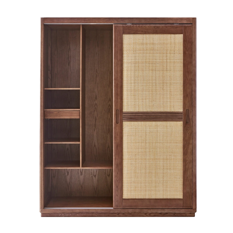 It is made of thick and large wooden boards, with vertical whole boards, doubling the load-bearing capacity and stability. The solid wood sliding door frame is paired with rattan MATS, made of imported agate rattan from Indonesia. The natural material is smooth and fine. The tiny gaps in the rattan allow for air circulation inside the cabinet, which is equivalent to installing an air purifier on the cabinet, keeping your clothes dry at all times. The interior design of the cabinet features multiple compartments. The double hanging area allows for the hanging of long and short clothes, and the multi-layer storage can stack more clothes. It is also equipped with a sliding hanger, which can be used to hang small items. The three-story large-capacity storage space on the right side can be used to hang long and short clothes, as well as to place seasonal bedding and so on. The wardrobe as a whole adopts a floor-to-ceiling design, which increases the space utilization rate, enhances the storage space, and also solves the problem of dust accumulation at the bottom that is difficult to clean.