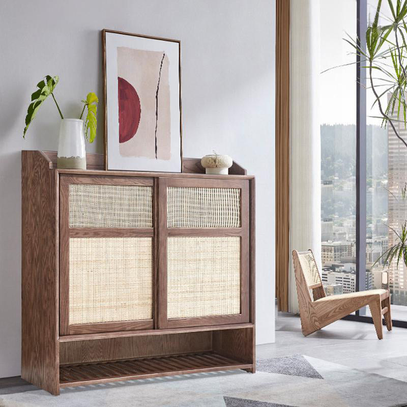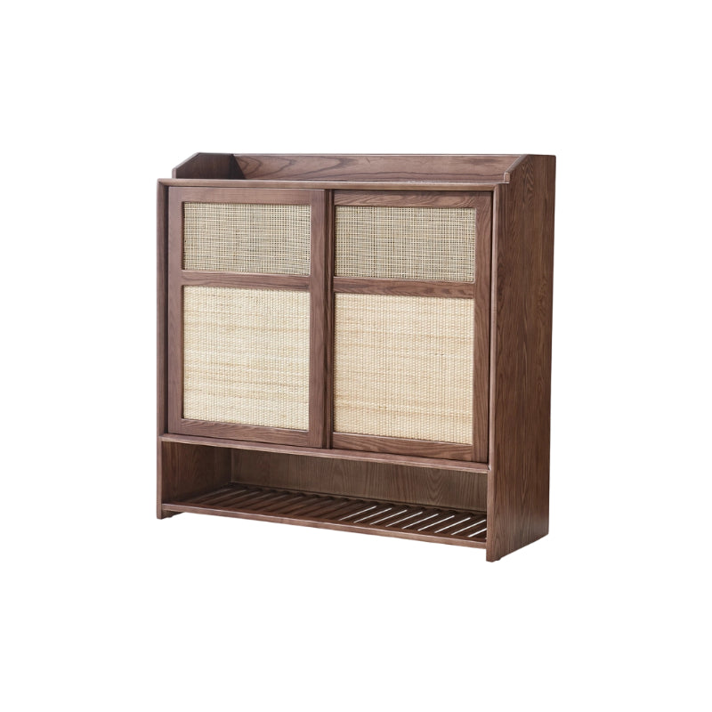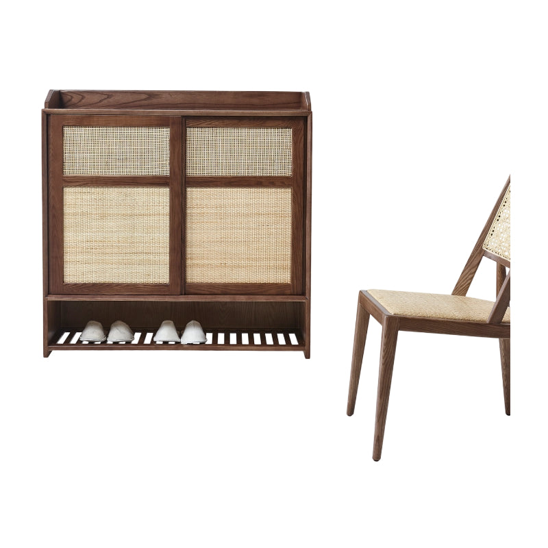 This shoe cabinet ingeniously blends classical elements with modern ones, presenting a simple and elegant style. The overall color is walnut wood, which is classic and versatile, and can blend well into various home decoration styles. High-quality imported ash wood from North America is selected, with clear grain, hard texture and not easy to deform. The cabinet door is made of imported agate rattan from Indonesia, which is not only beautiful but also has the function of ventilation. It has a large storage space with multiple layers of partitions, which can meet the storage needs of shoes of different heights. Whether it's pluse-sized shoes or high boots, they can all be easily placed. The bottom layer of the cabinet is an open shelf, which can hold frequently worn shoes, greatly improving the efficiency of life.