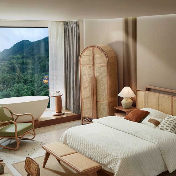 The main structure of the wardrobe cabinet is made of imported North American ash wood, with a simple and elegant texture. The top of the wardrobe is arched, and its shape is rather unique and creative. The interior space is rationally divided, with hanging Spaces suitable for hanging long clothes. There is a bedding storage area on the top and an open shoe storage area at the bottom. The cabinet door is a latticed rattan woven door panel, which is both fashionable and retro.