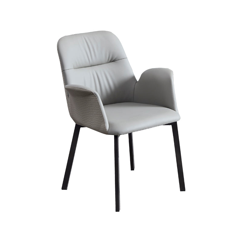 Adopting a patchwork technique of solid-colored leather and textured fabric, the light beige and dark gray dual color options are suitable for different styles. The semi-enclosed armrest and segmented backrest not only retain the simple outline but also enhance the sense of refinement through material contrast. The main body of the chair is made of fine and wear-resistant leather, and the texture areas add layers of touch. The high-elastic sponge filling ensures a soft sitting experience. The chair legs are slender and stable, taking into account both a light visual effect and practical load-bearing capacity. There are two types of under-frames to choose from, namely solid wood under-frames and carbon steel under-frames. It is suitable for modern light luxury and simple style living rooms and studies, and can also be used as high-quality seating in dining rooms. The combination of two chairs can add layers to the space and is a soft furnishing item that combines practicality and appearance.