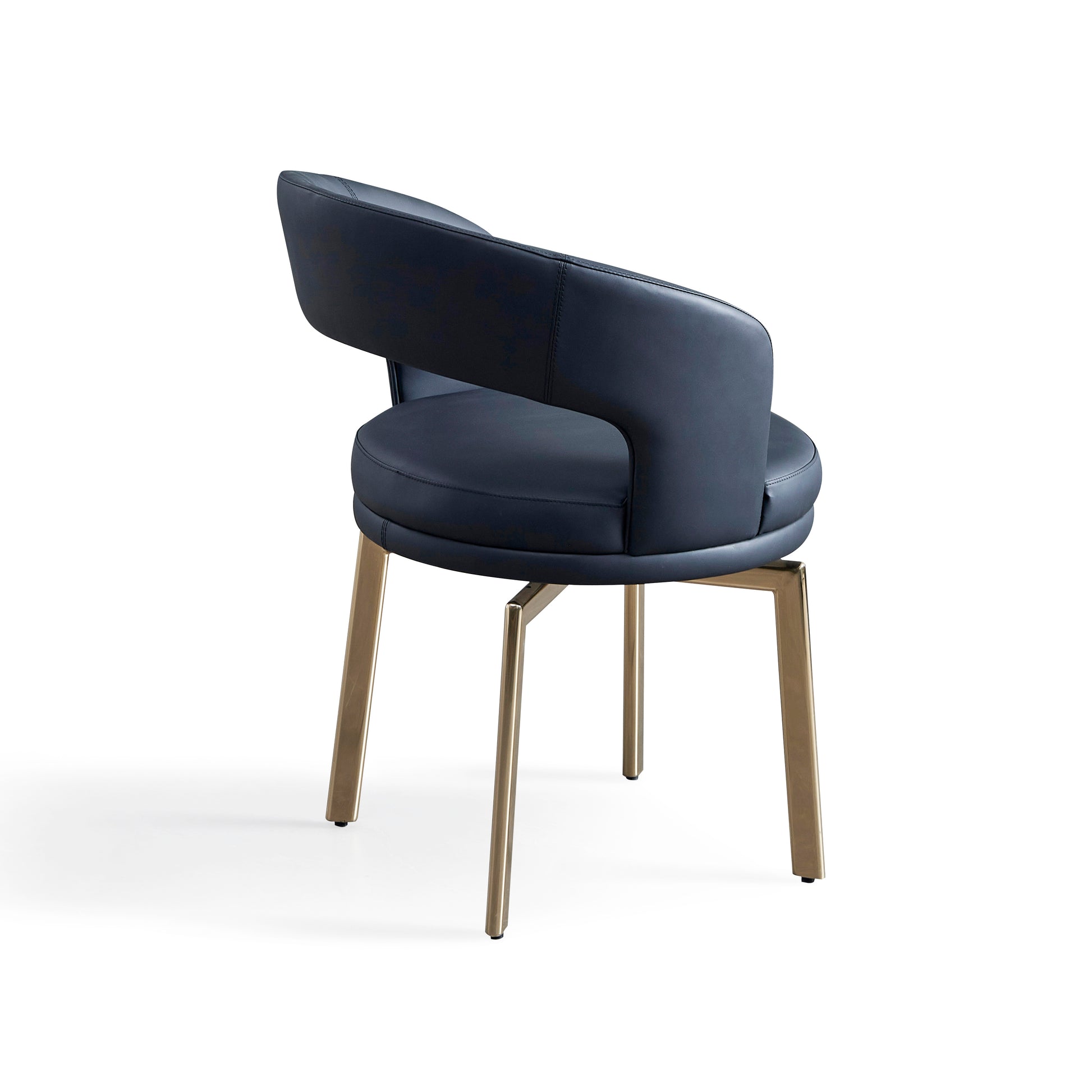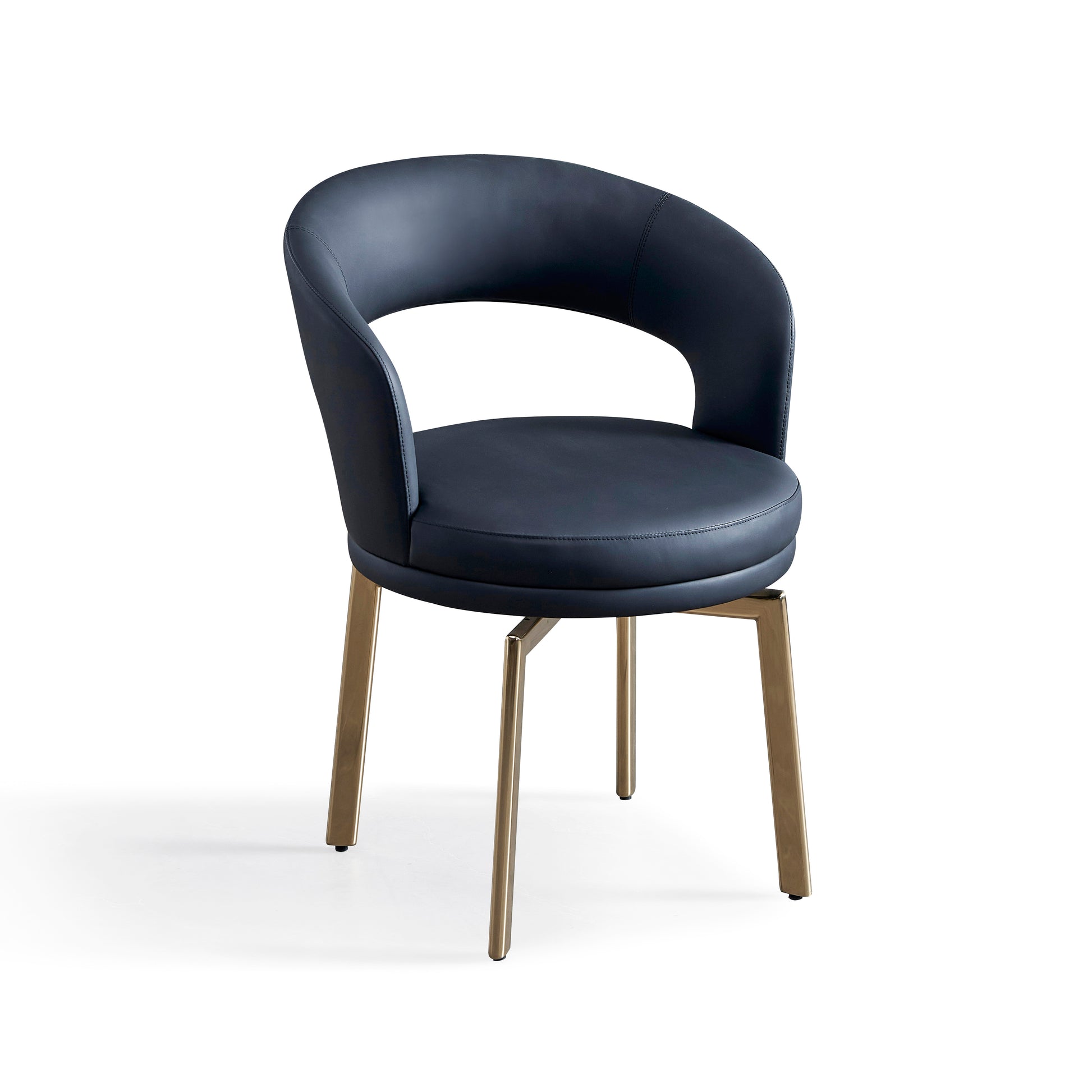 The semi-enclosed arc-shaped backrest and hollowed-out armrests feature a circular design with smooth and gentle lines, exuding an elegant and relaxed feel. The navy blue leather paired with champagne gold metal chair legs creates a high-end and light luxury texture through the collision of warm and cool tones. The chair body is made of fine and wear-resistant navy blue leather, filled with high-elasticity sponge, providing a soft sitting experience and strong support. The metal chair legs are made of matte champagne gold, with a delicate texture that is not prone to fading. The fine lines make the overall appearance more light and transparent. It is suitable for the living room leisure area and bar counter in light luxury and modern minimalist styles. It can also be used as seating in high-end dining Spaces. A single chair can become the texture focus of the space, combining comfort and decoration.